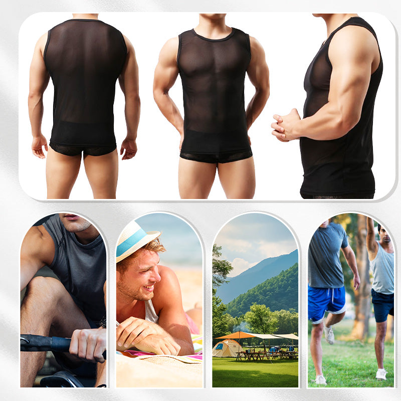 SUBTLE YET BOLD SHEER DESIGN: This tank top combines a subtle appearance with a bold twist. The sheer mesh fabric reveals a daring muscle-enhancing fit, perfect for both everyday wear and showcasing your physique.